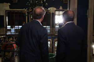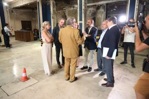Zaragoza (20/07/2023). El presidente del Gobierno de Aragón en funciones, Javier Lambán, ha visitado esta mañana la Cámara de Comercio de Zaragoza para conocer en persona el estado de las instalaciones y el avance de la limpieza tras el incendio sufrido el pasado mes. Lambán, que ha acudido acompañado por el vicepresidente en funciones, Arturo Aliaga, y la consejera de Presidencia en funciones, Mayte Pérez, ha valorado muy positivamente la larga relación que une a la Cámara con el Gobierno de Aragón, así como todos los programas y acciones llevadas a cabo en colaboración.